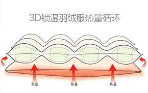 将热量反射循环持久锁住,减缓将身体的热量流失的速度,能将人体散出的热能反射回人体,达到蓄热保温的作用(类似急救毯及羽绒隔绝热能的原理)。